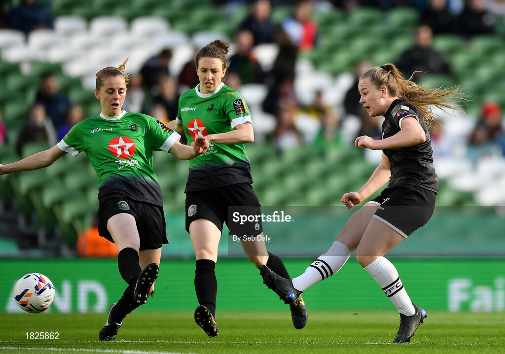 3 November 2019; Lauren Kelly of Wexford Youths, right, shoots to score her side's first goal, despite pressure from Claire Walsh, left, and Karen Duggan of Peamount United, during the Só Hotels FAI Women's Cup Final between Wexford Youths and Peamount United at the Aviva Stadium in Dublin. Photo by Seb Daly/Sportsfile