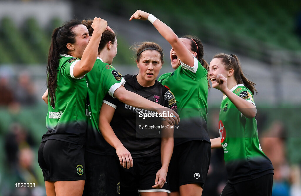 3 November 2019; Peamount United players celebrate their first goal scored by Karen Duggan as Edel Kennedy of Wexford Youths get caught up in the celebrations during the Só Hotels FAI Women's Cup Final between Wexford Youths and Peamount United at the Aviva Stadium in Dublin. Photo by Stephen McCarthy/Sportsfile