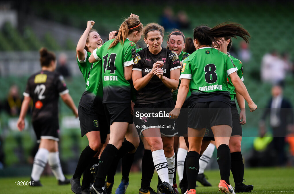 3 November 2019; Peamount United players celebrate their first goal scored by Karen Duggan as Edel Kennedy of Wexford Youths get caught up in the celebrations during the Só Hotels FAI Women's Cup Final between Wexford Youths and Peamount United at the Aviva Stadium in Dublin. Photo by Stephen McCarthy/Sportsfile