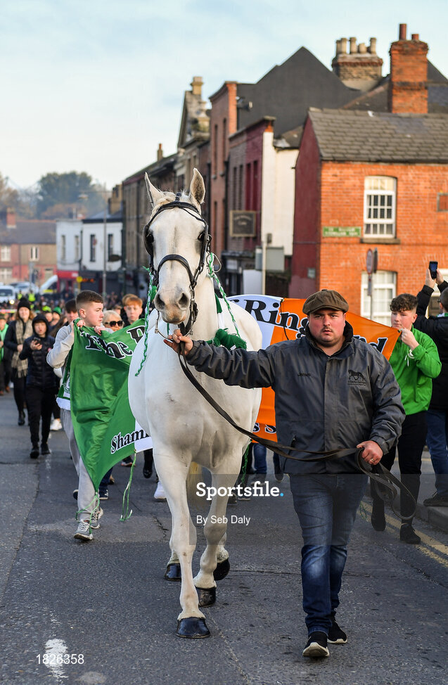 3 November 2019; Shamrock Rovers supporters lead Maggie the Horse across Ringsend Bridge along the traditional route to Aviva Stadium before the extra.ie FAI Cup Final between Dundalk and Shamrock Rovers at the Aviva Stadium in Dublin. Photo by Seb Daly/Sportsfile