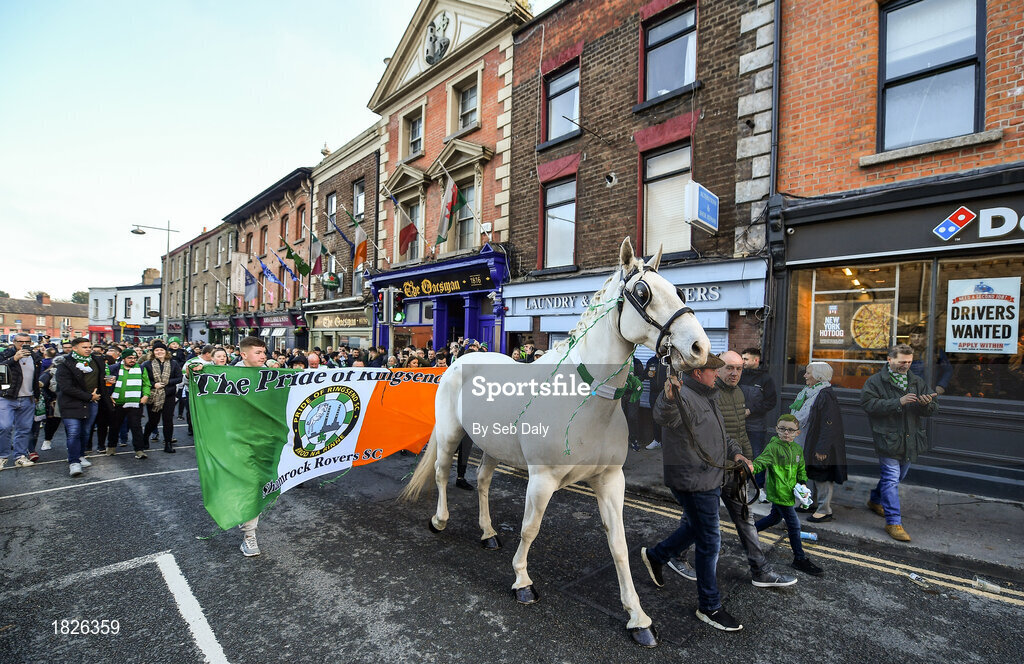 3 November 2019; Shamrock Rovers supporters lead Maggie the Horse through Ringsend along the traditional route to Aviva Stadium before the extra.ie FAI Cup Final between Dundalk and Shamrock Rovers at the Aviva Stadium in Dublin. Photo by Seb Daly/Sportsfile