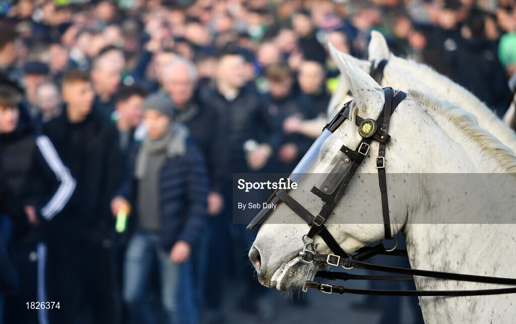 3 November 2019; A view of a Garda Mounted Support Unit horse in front of Shamrock Rovers fans before the extra.ie FAI Cup Final between Dundalk and Shamrock Rovers at the Aviva Stadium in Dublin. Photo by Seb Daly/Sportsfile