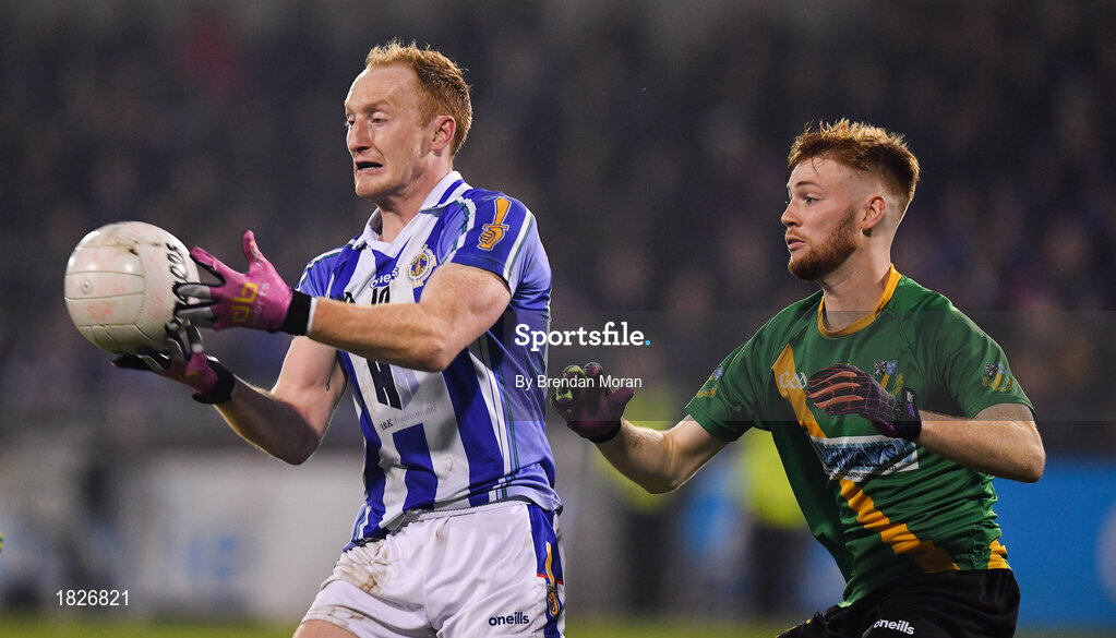 3 November 2019; Darren O'Reilly of Ballyboden St Enda's in action against Sean Kennedy of Thomas Davis during the Dublin County Senior Club Football Championship Final match between Thomas Davis and Ballyboden St Enda's at Parnell Park in Dublin. Photo by Brendan Moran/Sportsfile