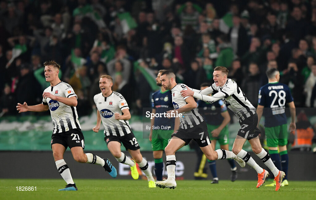 3 November 2019; Michael Duffy of Dundalk, 7, celebrates with team-mates after scoring his side's first goal during the extra.ie FAI Cup Final between Dundalk and Shamrock Rovers at the Aviva Stadium in Dublin. Photo by Seb Daly/Sportsfile