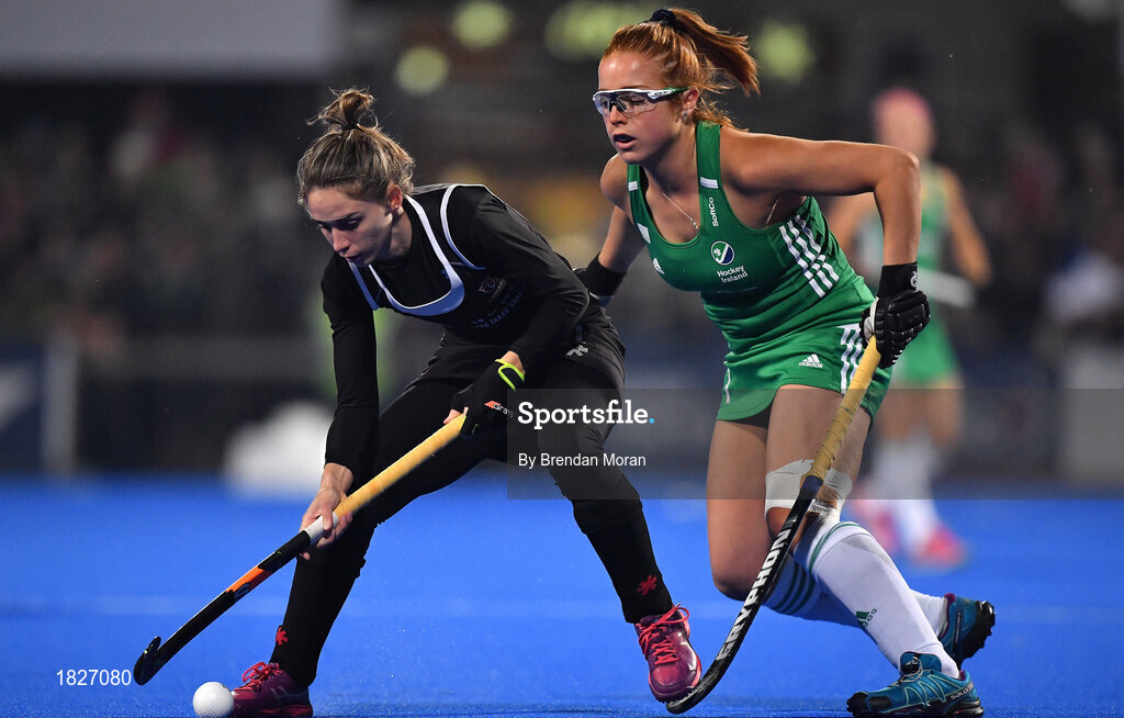 3 November 2019; Amanda Woodcroft of Canada in action against Zoe Wilson of Ireland during the FIH Women's Olympic Qualifier match between Ireland and Canada at Energia Park in Dublin. Photo by Brendan Moran/Sportsfile