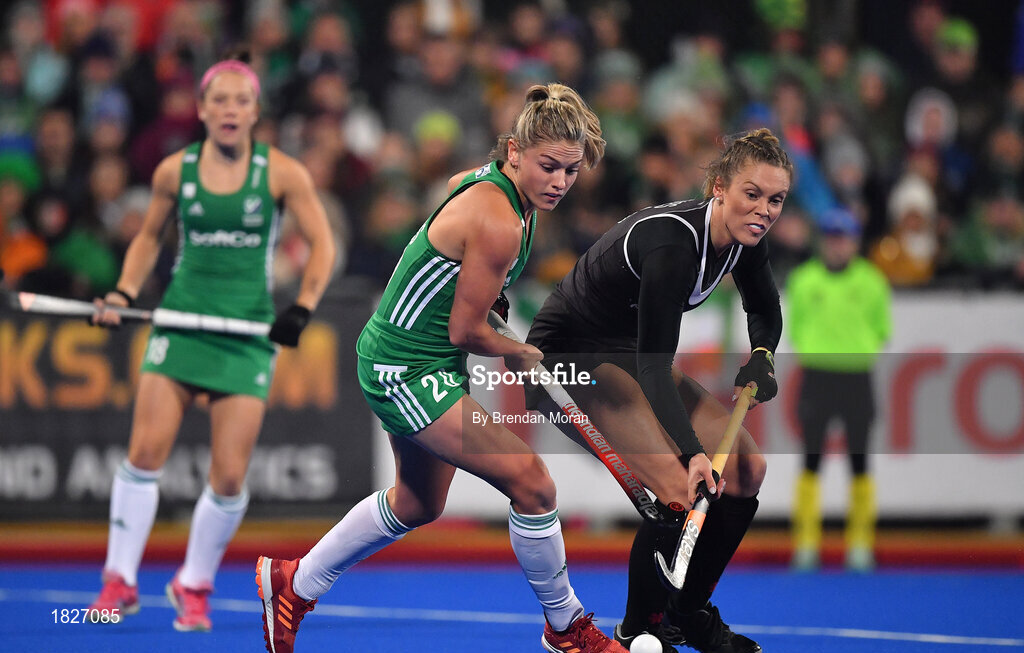3 November 2019; Chloe Watkins of Ireland in action against Brienne Stairs of Canada during the FIH Women's Olympic Qualifier match between Ireland and Canada at Energia Park in Dublin. Photo by Brendan Moran/Sportsfile