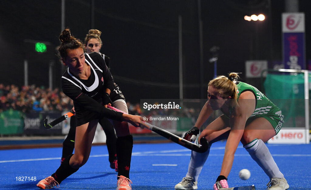 3 November 2019; Sara McManus of Canada in action against Sarah Hawkshaw of Ireland during the FIH Women's Olympic Qualifier match between Ireland and Canada at Energia Park in Dublin. Photo by Brendan Moran/Sportsfile