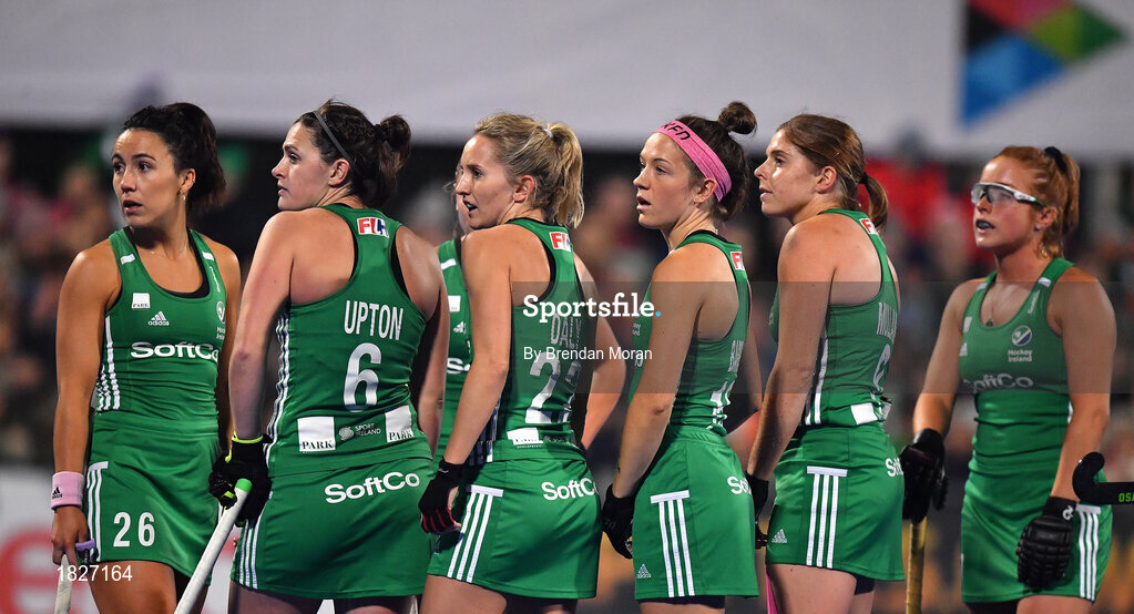 3 November 2019; Ireland players wait on a video referral during the second quarter of the FIH Women's Olympic Qualifier match between Ireland and Canada at Energia Park in Dublin. Photo by Brendan Moran/ Sportsfile
