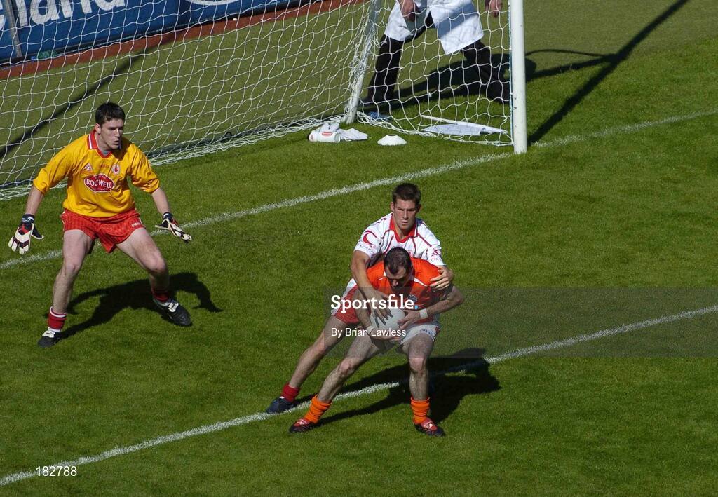 10 July 2005; Steven McDonnell of Armagh wins possession on the edge of the square ahead of Shane Sweeney of Tyrone before scoring his side's second goal during the Bank of Ireland Ulster Senior Football Championship Final match between Armagh and Tyrone at Croke Park in Dublin. Photo by Brian Lawless/Sportsfile