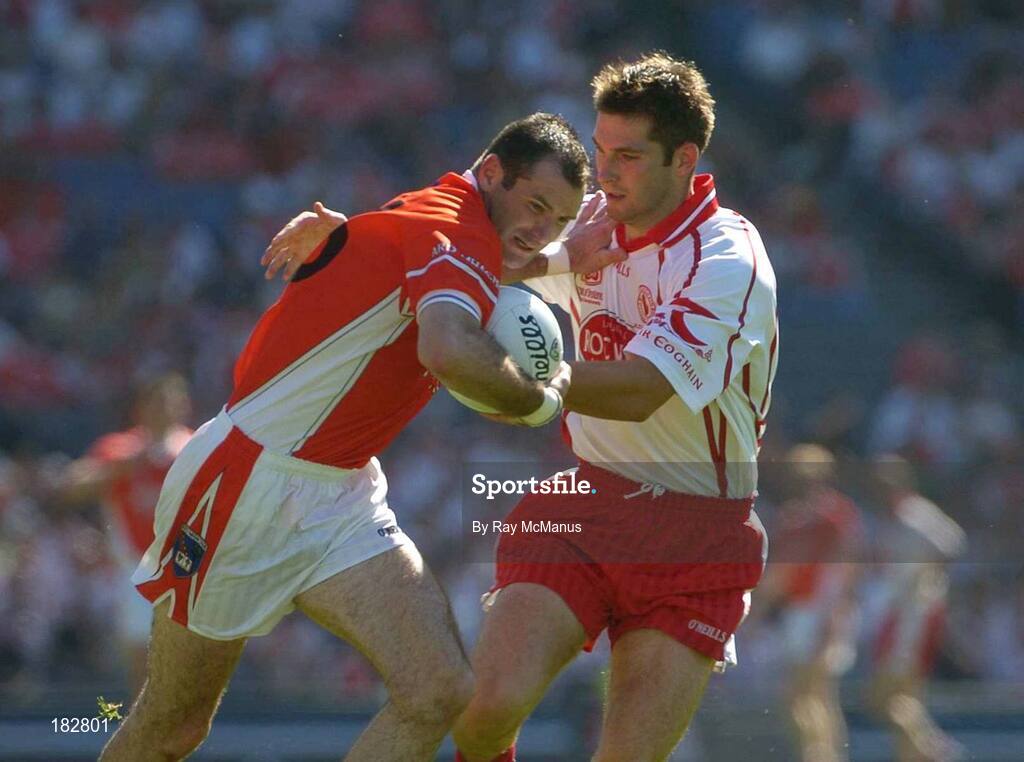 10 July 2005; Steven McDonnell, Tyrone, is tackled by Shane Sweeney, Armagh. Bank of Ireland Ulster Senior Football Championship Final, Armagh v Tyrone, Croke Park, Dublin. Picture credit; Ray McManus / SPORTSFILE