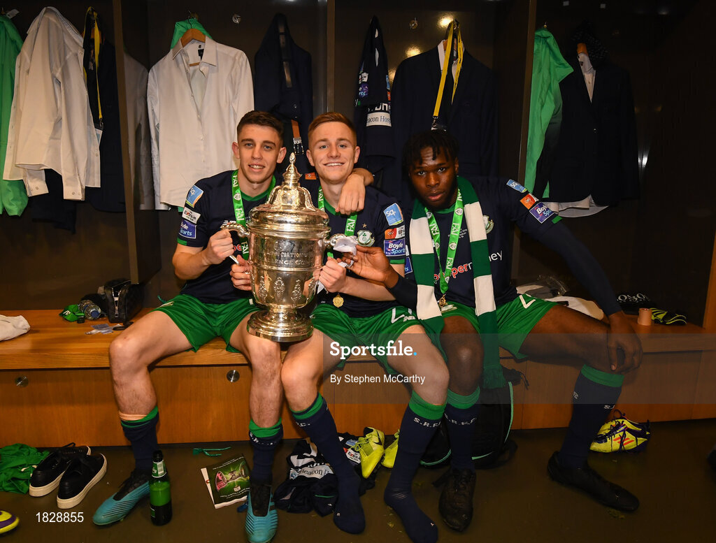 3 November 2019; Shamrock Rovers players, from left, Gary O'Neill, Brandon Kavanagh and Thomas Oluwa celebrate following the extra.ie FAI Cup Final between Dundalk and Shamrock Rovers at the Aviva Stadium in Dublin. Photo by Stephen McCarthy/Sportsfile