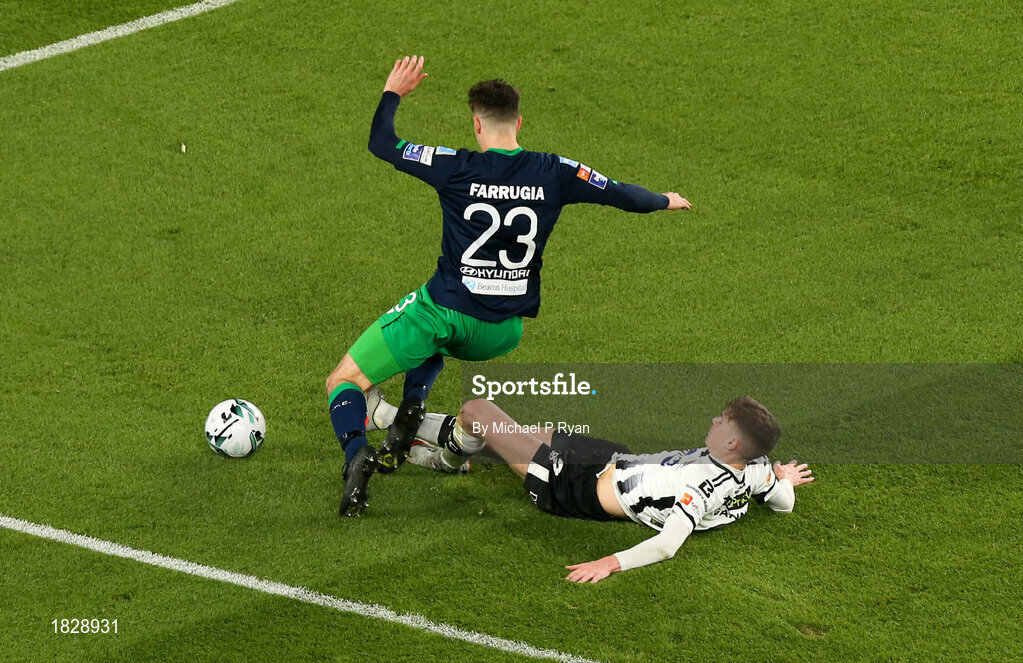 3 November 2019; Neil Farrugia of Shamrock Rovers is tackled by Seán Gannon of Dundalk during the extra.ie FAI Cup Final between Dundalk and Shamrock Rovers at the Aviva Stadium in Dublin. Photo by Michael P Ryan/Sportsfile