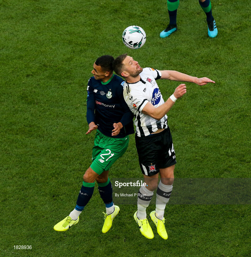 3 November 2019; Dane Massey of Dundalk in action against Graham Burke of Shamrock Rovers during the extra.ie FAI Cup Final between Dundalk and Shamrock Rovers at the Aviva Stadium in Dublin. Photo by Michael P Ryan/Sportsfile