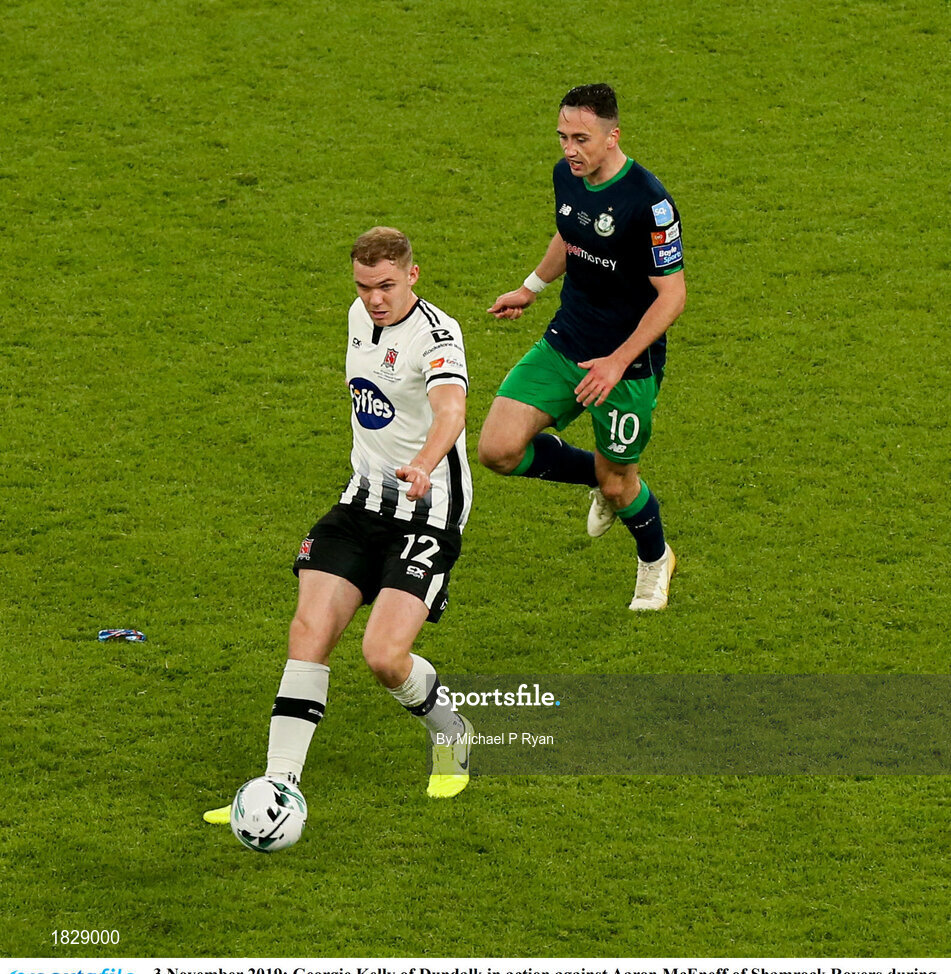 3 November 2019; Georgie Kelly of Dundalk in action against Aaron McEneff of Shamrock Rovers during the extra.ie FAI Cup Final between Dundalk and Shamrock Rovers at the Aviva Stadium in Dublin. Photo by Michael P Ryan/Sportsfile