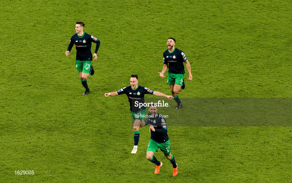 3 November 2019; Shamrock Rovers players celebrate after winning the penalty shootout during the extra.ie FAI Cup Final between Dundalk and Shamrock Rovers at the Aviva Stadium in Dublin. Photo by Michael P Ryan/Sportsfile