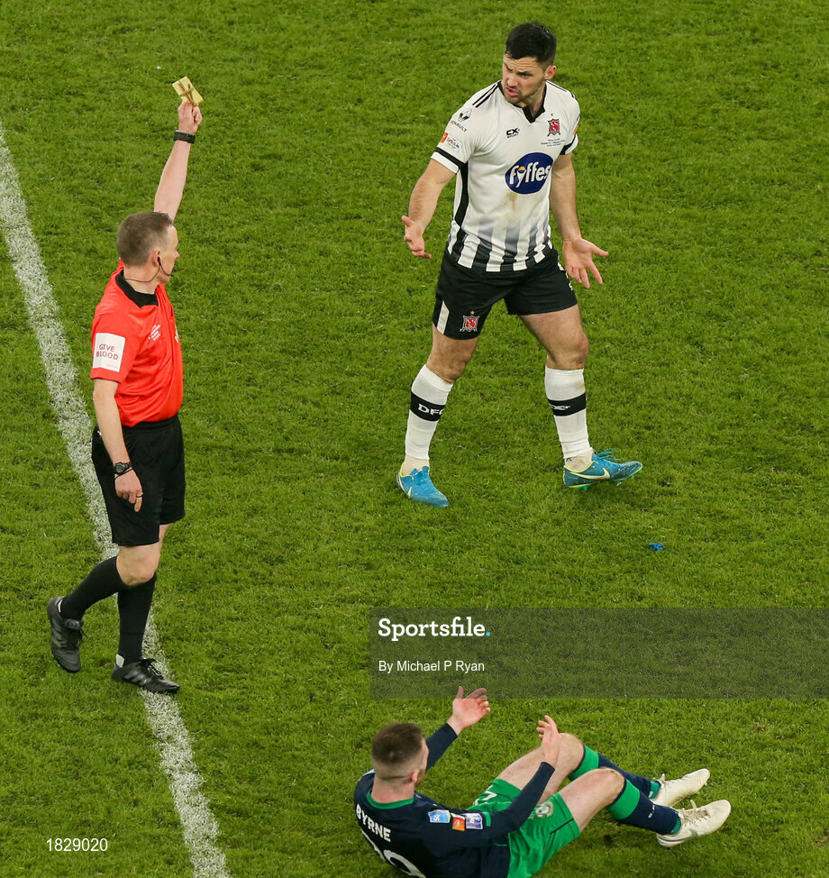 3 November 2019; Patrick Hoban of Dundalk receives a yellow card from referee Derek Tomney during the extra.ie FAI Cup Final between Dundalk and Shamrock Rovers at the Aviva Stadium in Dublin. Photo by Michael P Ryan/Sportsfile