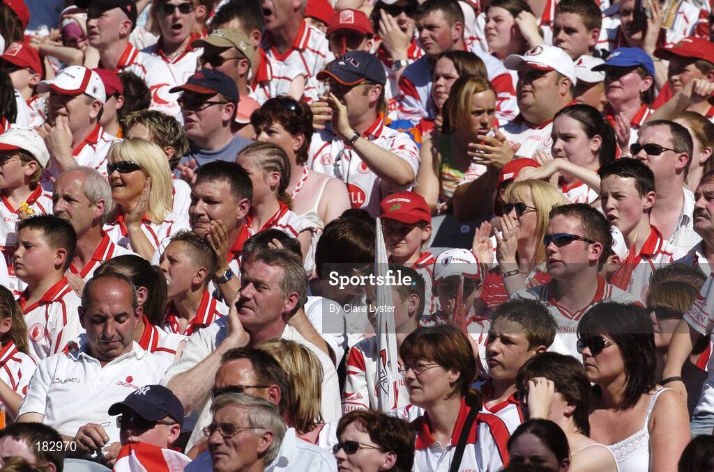 10 July 2005; Tyrone fans cheer on their side during the game. Bank of Ireland Ulster Senior Football Championship Final, Armagh v Tyrone, Croke Park, Dublin. Picture credit; Ciara Lyster / SPORTSFILE