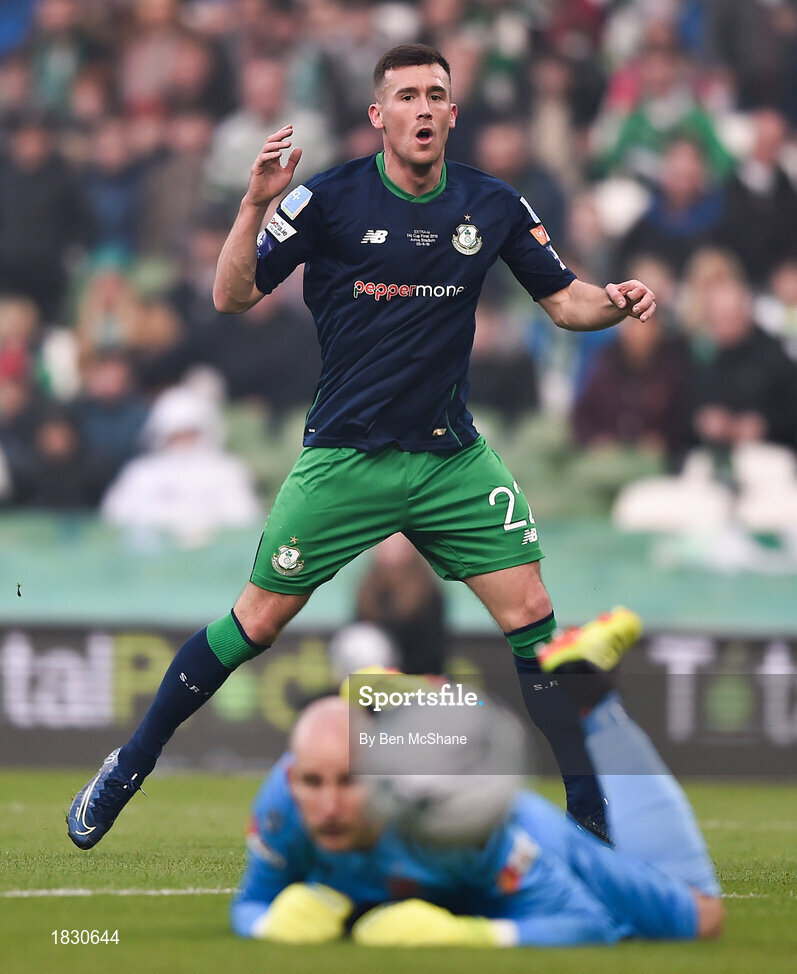 3 November 2019; Aaron Greene of Shamrock Rovers and Dundalk goalkeeper Gary Rogers watch a shot go wide of the post during the extra.ie FAI Cup Final between Dundalk and Shamrock Rovers at the Aviva Stadium in Dublin. Photo by Ben McShane/Sportsfile