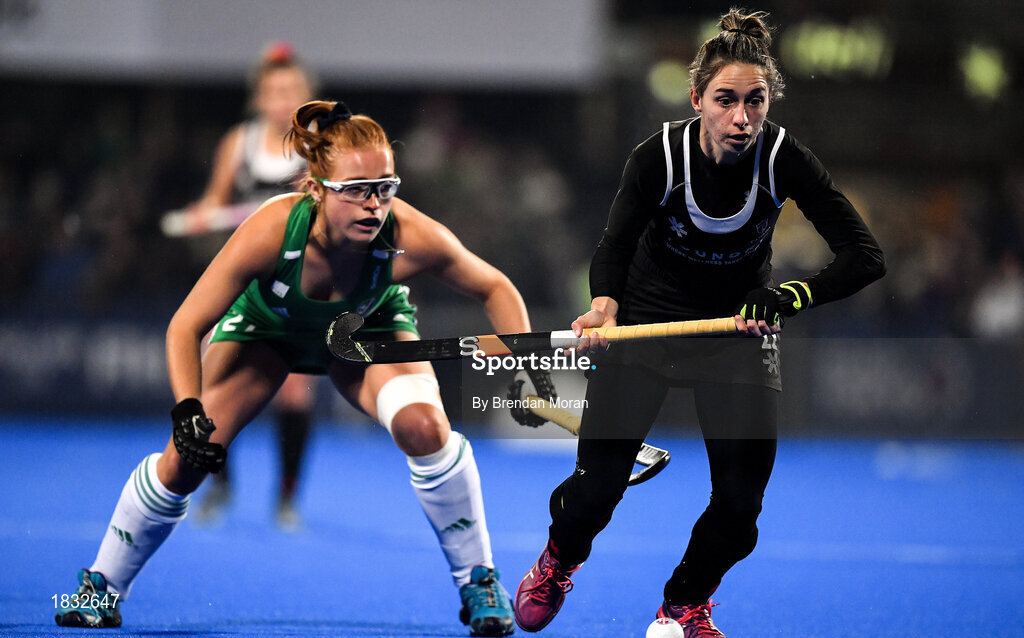 3 November 2019; Amanda Woodcroft of Canada in action against Zoe Wilson of Ireland during the FIH Women's Olympic Qualifier match between Ireland and Canada at Energia Park in Dublin. Photo by Brendan Moran/Sportsfile