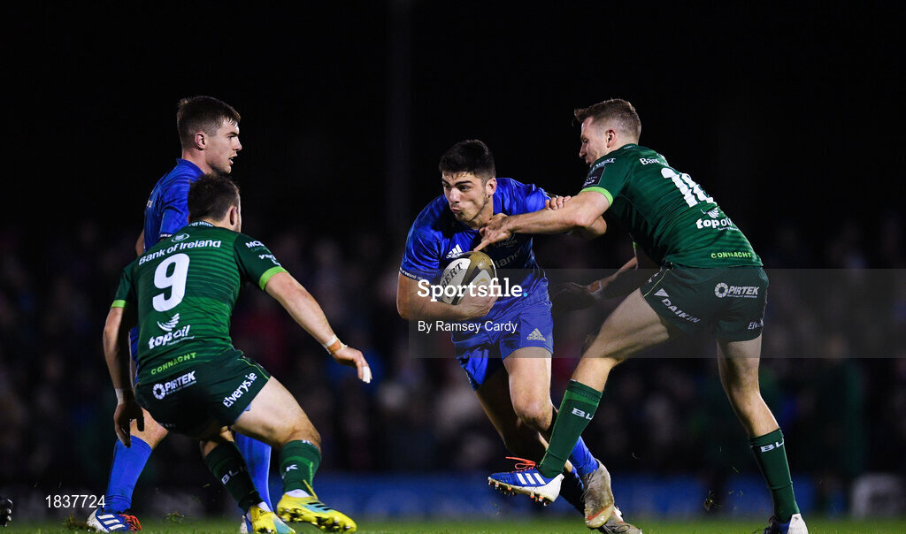 8 November 2019; Jimmy O'Brien of Leinster is tackled by Jack Carty of Connacht during the Guinness PRO14 Round 6 match between Connacht and Leinster at the Sportsground in Galway. Photo by Ramsey Cardy/Sportsfile