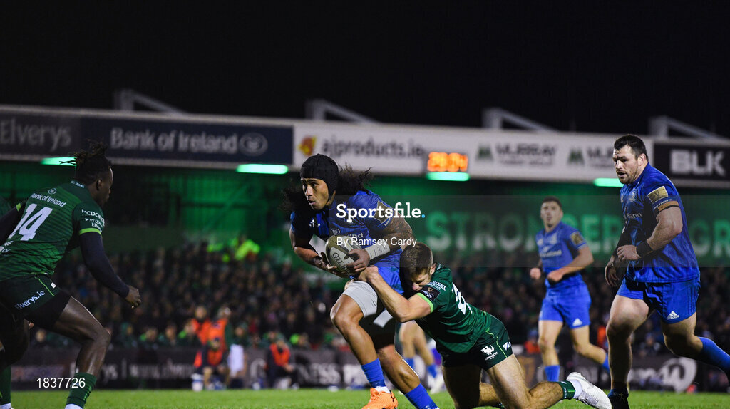 8 November 2019; Joe Tomane of Leinster is tackled by Kyle Godwin of Connacht during the Guinness PRO14 Round 6 match between Connacht and Leinster at the Sportsground in Galway. Photo by Ramsey Cardy/Sportsfile