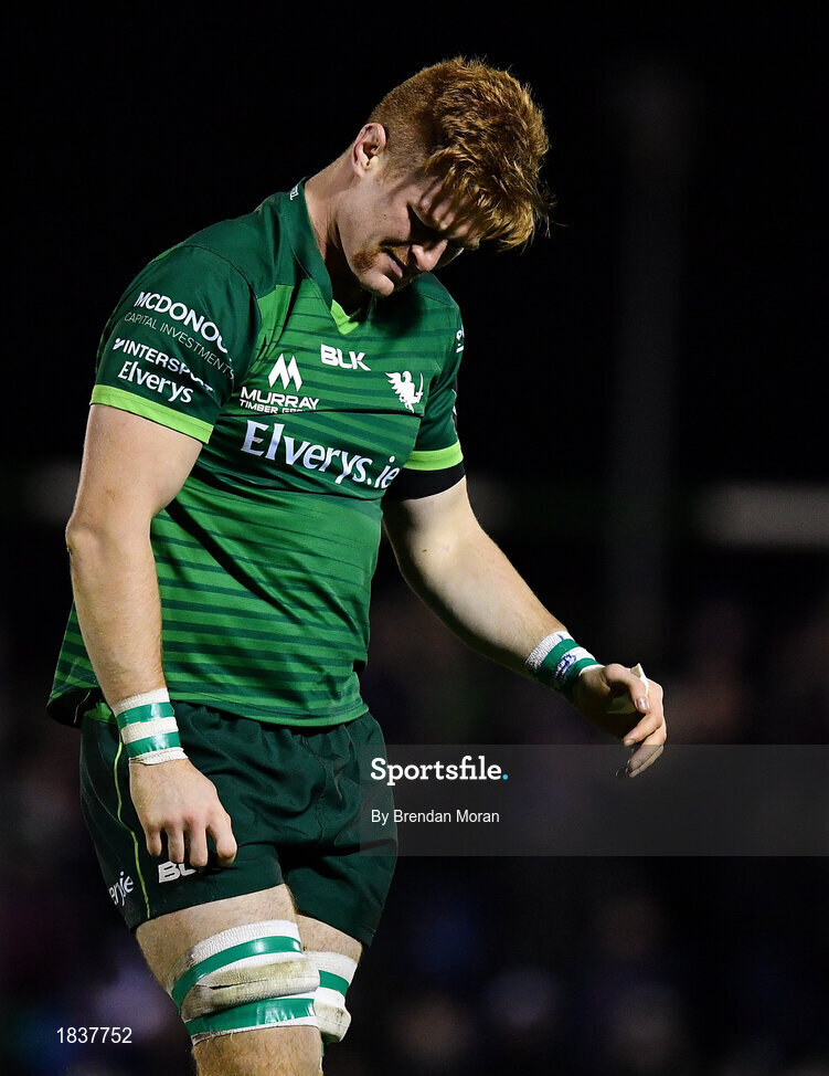 8 November 2019; Sean O’Brien of Connacht leaves the pitch with a shoulder injury during the Guinness PRO14 Round 6 match between Connacht and Leinster in the Sportsground in Galway. Photo by Brendan Moran/Sportsfile