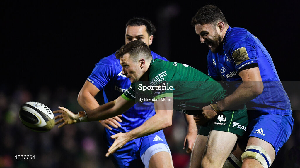8 November 2019; Jack Carty of Connacht is tackled by Josh Murphy of Leinster during the Guinness PRO14 Round 6 match between Connacht and Leinster in the Sportsground in Galway. Photo by Brendan Moran/Sportsfile