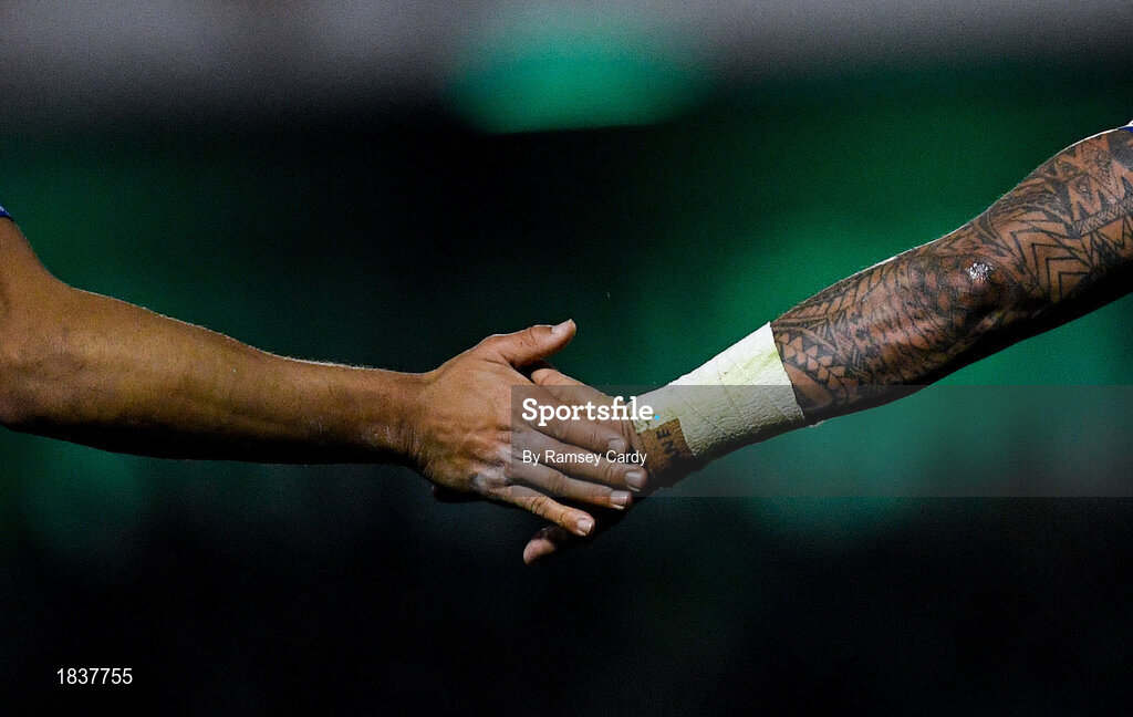 8 November 2019; Adam Byrne and Joe Tomane of Leinster celebrate scoring a try during the Guinness PRO14 Round 6 match between Connacht and Leinster at the Sportsground in Galway. Photo by Ramsey Cardy/Sportsfile