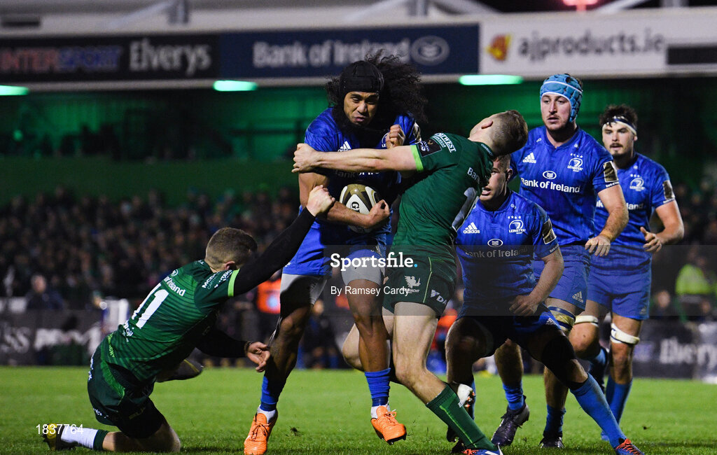 8 November 2019; Joe Tomane of Leinster is tackled by Stephen Fitzgerald, left, and Jack Carty of Connacht during the Guinness PRO14 Round 6 match between Connacht and Leinster at the Sportsground in Galway. Photo by Ramsey Cardy/Sportsfile