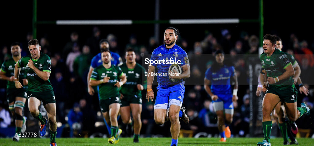 8 November 2019; James Lowe of Leinster on the way to scoring his side's sixth try during the Guinness PRO14 Round 6 match between Connacht and Leinster in the Sportsground in Galway. Photo by Brendan Moran/Sportsfile