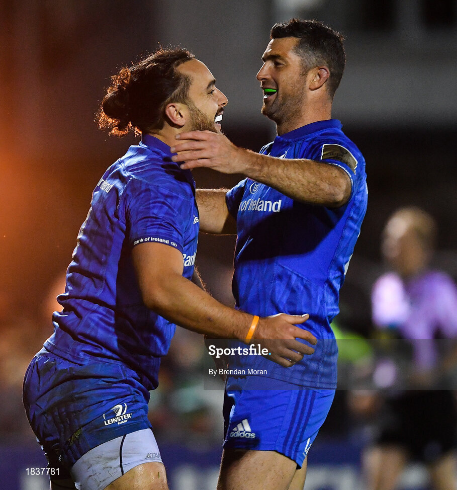 8 November 2019; James Lowe of Leinster, left, celebrates with team-mate Rob Kearney after scoring their side's sixth try during the Guinness PRO14 Round 6 match between Connacht and Leinster in the Sportsground in Galway. Photo by Brendan Moran/Sportsfile