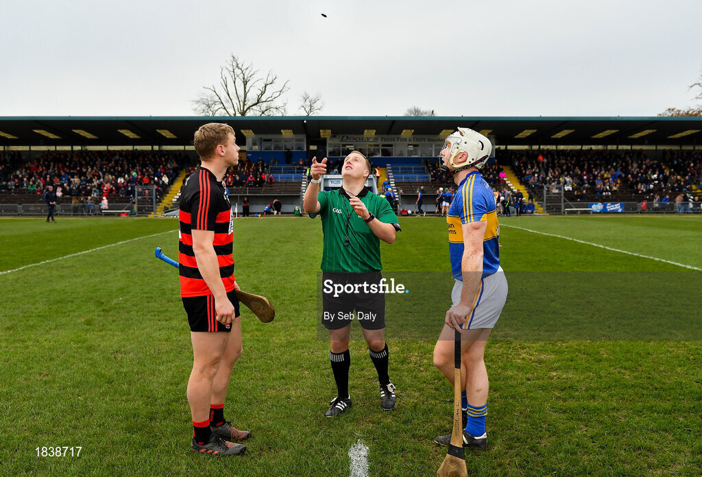 10 November 2019; Referee Nathan Wall with captains Philip Mahony of Ballygunner and Cian Lynch of Patrickswell during the coin toss prior to the AIB Munster GAA Hurling Senior Club Championship Semi-Final match between Patrickswell and Ballygunner at Walsh Park in Waterford. Photo by Seb Daly/Sportsfile