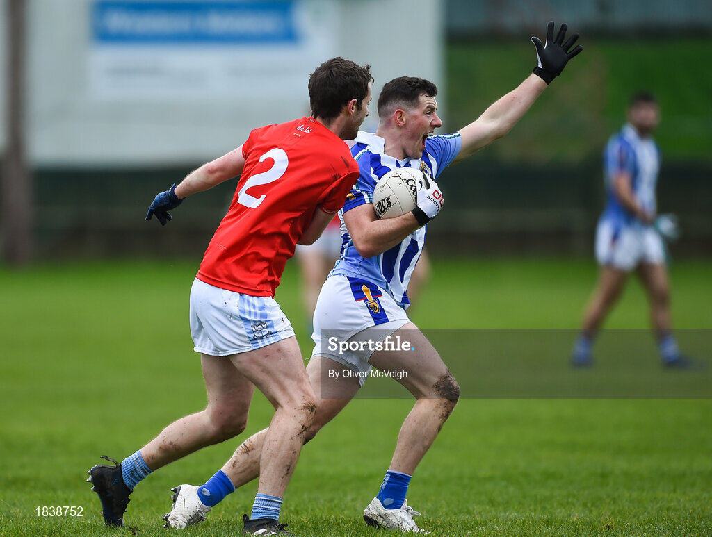 10 November 2019; Ryan Basquel of Ballyboden St Enda's in action against Kevin Carr of Newtown Blues during the AIB Leinster GAA Football Senior Club Championship Quarter-Final match between Newtown Blues and Ballyboden St Enda's at the Gaelic Grounds in Drogheda, Co Louth. Photo by Oliver McVeigh/Sportsfile