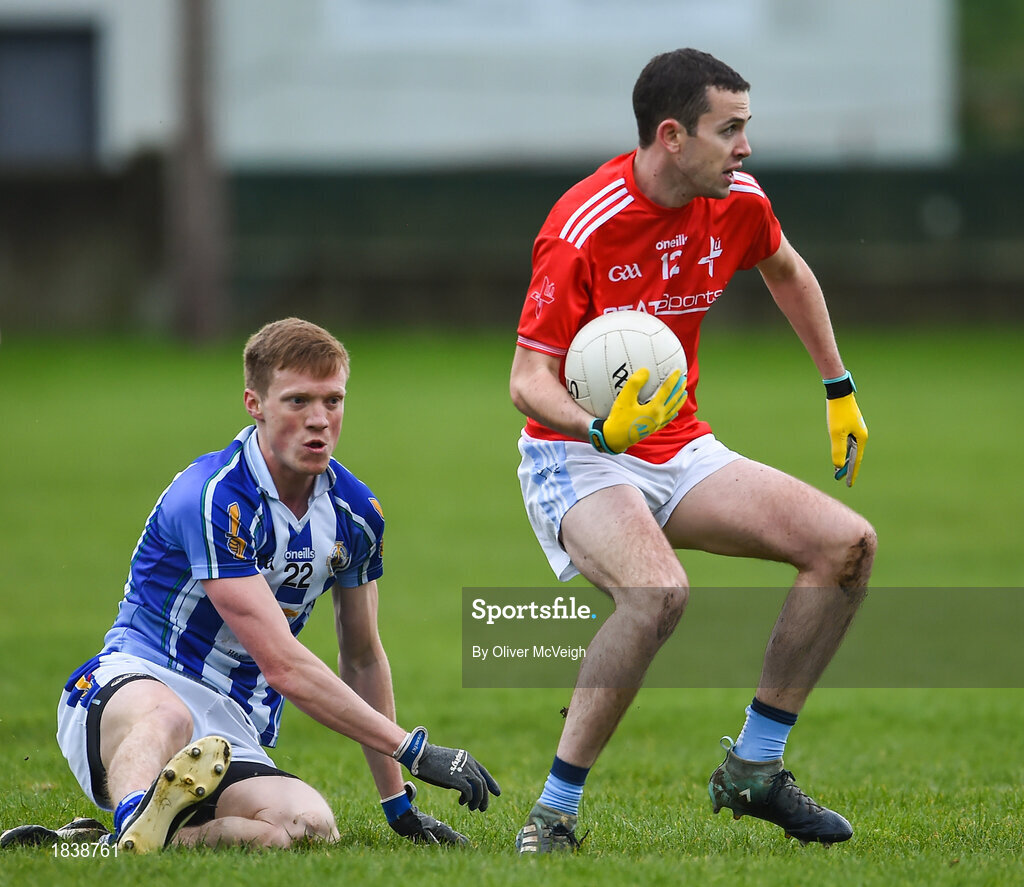10 November 2019; Robert Carr of Newtown Blues in action against Brian Bobbett of Ballyboden St Enda's during the AIB Leinster GAA Football Senior Club Championship Quarter-Final match between Newtown Blues and Ballyboden St Enda's at the Gaelic Grounds in Drogheda, Co Louth. Photo by Oliver McVeigh/Sportsfile