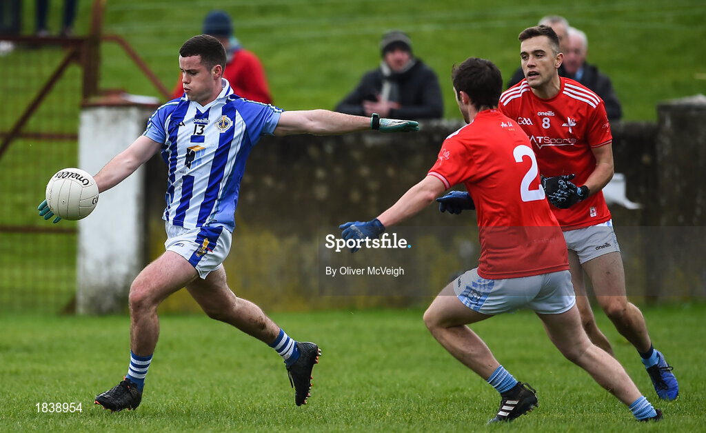 10 November 2019; Ross McGarry of Ballyboden St Enda's in action against Kevin Carr of Newtown Blues during the AIB Leinster GAA Football Senior Club Championship Quarter-Final match between Newtown Blues and Ballyboden St Enda's at the Gaelic Grounds in Drogheda, Co Louth. Photo by Oliver McVeigh/Sportsfile