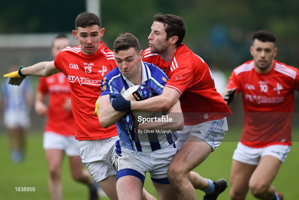 10 November 2019; Aran Waters of Ballyboden St Enda's in action against Ciaran Downey and Kevin Carr of Newtown Blues during the AIB Leinster GAA Football Senior Club Championship Quarter-Final match between Newtown Blues and Ballyboden St Enda's at the Gaelic Grounds in Drogheda, Co Louth. Photo by Oliver McVeigh/Sportsfile