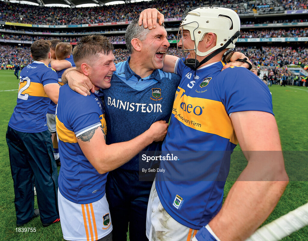 18 August 2019; Seconds after the final whistle Liam Sheedy hugs Willie Connors, one of the new kids on the block who came off the bench to contribute two points, and Brendan Maher, overjoyed to be here a year on from a torn cruciate injury. It’s these minutes, once victory is confirmed, which are often cited as a career highlight – and it’s not hard to see why. Photo by Seb Daly/Sportsfile