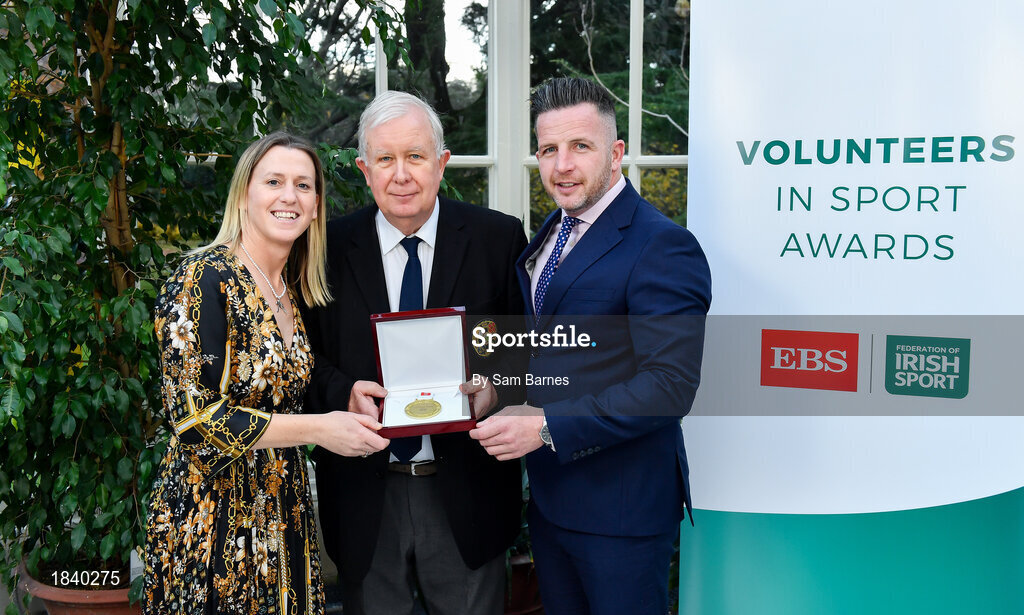 12 November 2019; Seamus Kyne of the Irish Indoor Bowling Association, from Co. Derry, is presented with their award by Mary O'Connor, CEO of the Federation of Irish Sport, and Richard Gernon, Regional Manager EBS, during the Volunteers in Sport Awards presented by Federation of Irish Sport with EBS at Farmleigh House in Phoenix Park, Dublin. Photo by Sam Barnes/Sportsfile