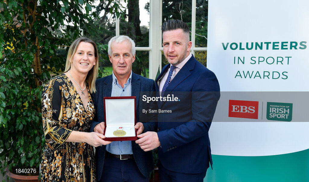 12 November 2019; Eugene Dolan of St Pauls GAA, Co. Westmeath, is presented with their award by Mary O'Connor, CEO of the Federation of Irish Sport, and Richard Gernon, Regional Manager EBS, during the Volunteers in Sport Awards presented by Federation of Irish Sport with EBS at Farmleigh House in Phoenix Park, Dublin. Photo by Sam Barnes/Sportsfile