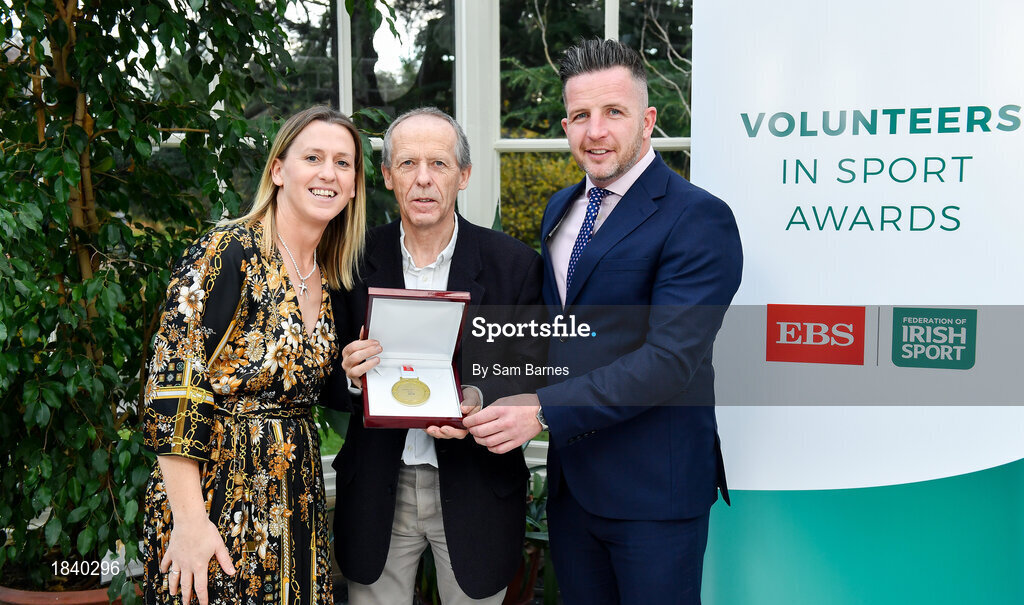 12 November 2019; Liam Evans of St James' GAA Club, Co. Cork, is presented with their award by Mary O'Connor, CEO of the Federation of Irish Sport, and Richard Gernon, Regional Manager EBS, during the Volunteers in Sport Awards presented by Federation of Irish Sport with EBS at Farmleigh House in Phoenix Park, Dublin. Photo by Sam Barnes/Sportsfile