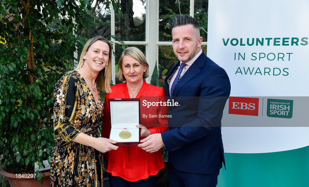 12 November 2019; Gaye Conway of Enniskillen Royal Boat Club, Co. Fermanagh, is presented with their award by Mary O'Connor, CEO of the Federation of Irish Sport, and Richard Gernon, Regional Manager EBS, during the Volunteers in Sport Awards presented by Federation of Irish Sport with EBS at Farmleigh House in Phoenix Park, Dublin. Photo by Sam Barnes/Sportsfile