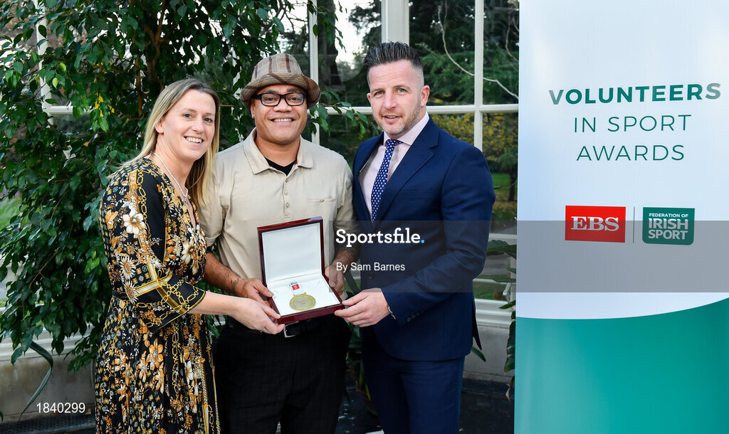 12 November 2019; Fetaoi Faapito of Dundalk Rovers Basketball Club, Co Louth, is presented with their award by Mary O'Connor, CEO of the Federation of Irish Sport, and Richard Gernon, Regional Manager EBS, during the Volunteers in Sport Awards presented by Federation of Irish Sport with EBS at Farmleigh House in Phoenix Park, Dublin. Photo by Sam Barnes/Sportsfile