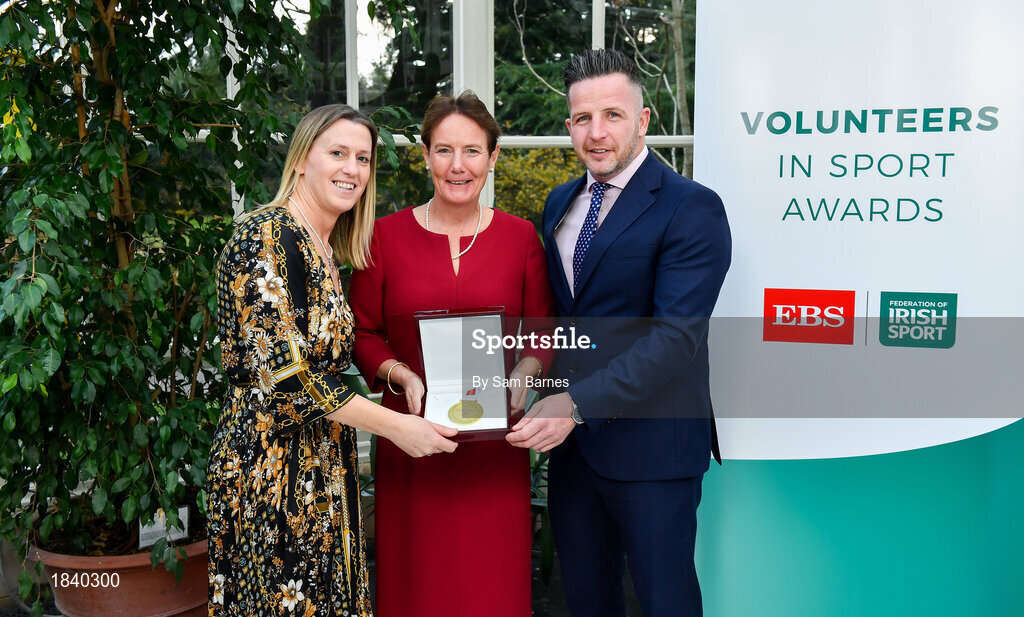 12 November 2019; Bronwyn O'Donnell of Loreto Hockey Club, Co. Dublin is presented with their award by Mary O'Connor, CEO of the Federation of Irish Sport, and Richard Gernon, Regional Manager EBS, during the Volunteers in Sport Awards presented by Federation of Irish Sport with EBS at Farmleigh House in Phoenix Park, Dublin. Photo by Sam Barnes/Sportsfile
