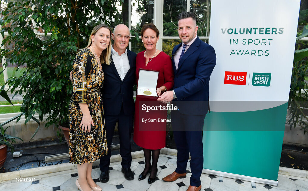12 November 2019; Bronwyn O'Donnell of Loreto Hockey Club, Co. Dublin, is presented with their award by Mary O'Connor, CEO of the Federation of Irish Sport, and Richard Gernon, Regional Manager EBS, alongside her husband, Conor, during the Volunteers in Sport Awards presented by Federation of Irish Sport with EBS at Farmleigh House in Phoenix Park, Dublin. Photo by Sam Barnes/Sportsfile