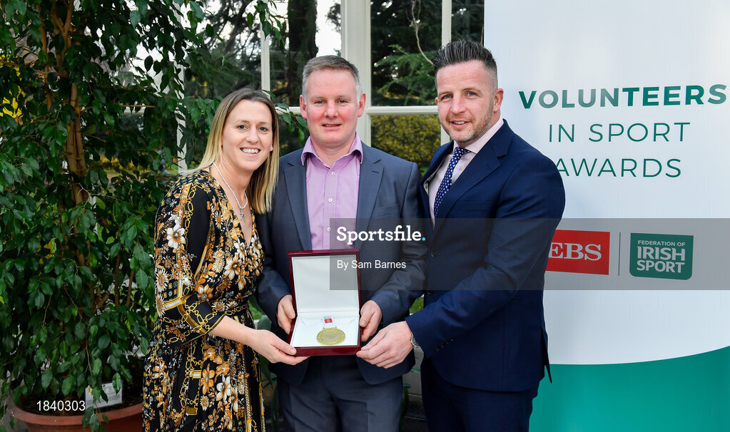 12 November 2019; Paul Cummins of Kilkenny Storm Ice Hockey, Co. Kilkenny, is presented with their award by Mary O'Connor, CEO of the Federation of Irish Sport, and Richard Gernon, Regional Manager EBS, during the Volunteers in Sport Awards presented by Federation of Irish Sport with EBS at Farmleigh House in Phoenix Park, Dublin. Photo by Sam Barnes/Sportsfile