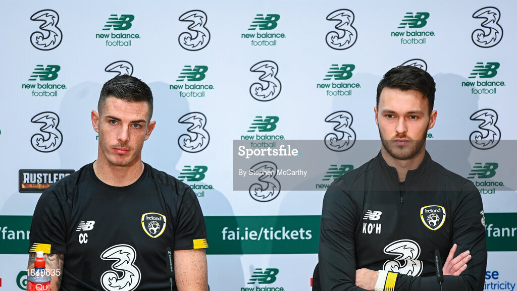13 November 2019; Ciaran Clark, left, and Kieran O'Hara during a Republic of Ireland press conference at the FAI National Training Centre in Abbotstown, Dublin. Photo by Stephen McCarthy/Sportsfile