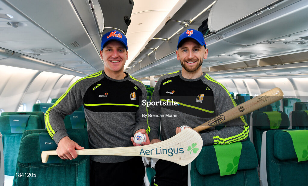 14 November 2019; Kilkenny hurlers departed Dublin Airport for New York today onboard Aer Lingus flight EI105. This is the fourth year that Aer Lingus is involved in the Hurling Classic and sees Ireland’s only 4-Star airline as the Official Airline of the New York Hurling Classic. Matches take place in Citi Field, home of the New York Mets, on November 16th and are played in the Super 11s format. Limerick will be looking to retain the Hurling Classic title they won in 2018 as they take on Wexford in the first semi-final. Reigning All-Ireland champions Tipperary play Kilkenny in the second semi-final, followed by the final later that day. Pictured are Kilkenny players Eoin Murphy, left, and Conor Fogarty. Photo by Brendan Moran/Sportsfile