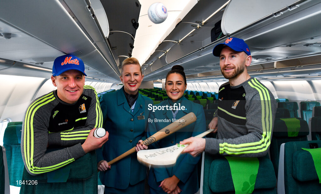 14 November 2019; Kilkenny hurlers departed Dublin Airport for New York today onboard Aer Lingus flight EI105. This is the fourth year that Aer Lingus is involved in the Hurling Classic and sees Ireland’s only 4-Star airline as the Official Airline of the New York Hurling Classic. Matches take place in Citi Field, home of the New York Mets, on November 16th and are played in the Super 11s format. Limerick will be looking to retain the Hurling Classic title they won in 2018 as they take on Wexford in the first semi-final. Reigning All-Ireland champions Tipperary play Kilkenny in the second semi-final, followed by the final later that day. Pictured is Aer Lingus Cabin Service Manager Gwen Reynolds, 2nd from left, and Cabin Crew member Holly Sheridan with Kilkenny players Eoin Murphy, left, and Conor Fogarty. Photo by Brendan Moran/Sportsfile