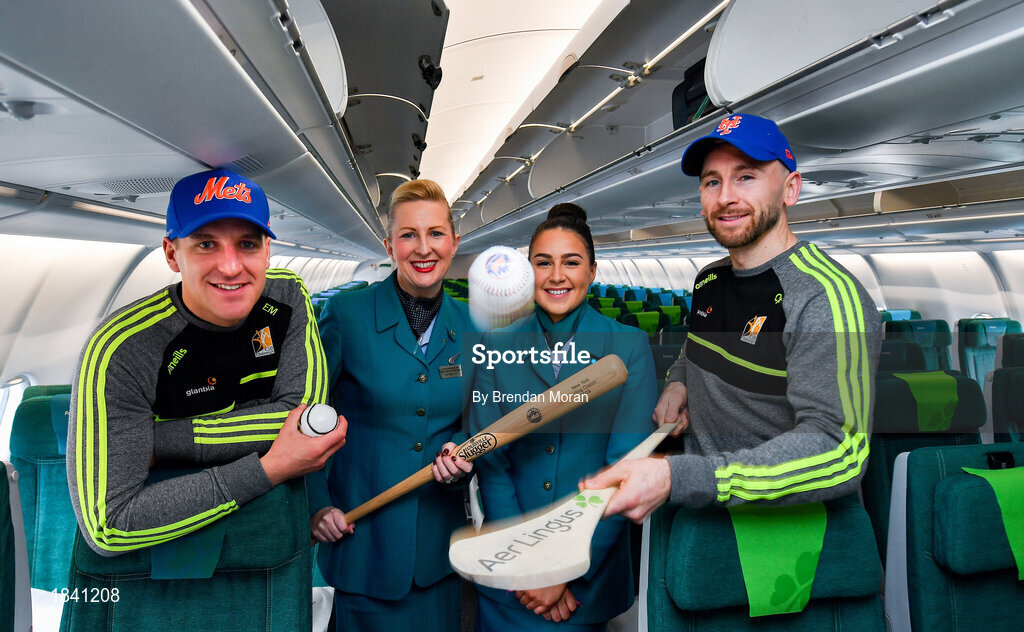 14 November 2019; Kilkenny hurlers departed Dublin Airport for New York today onboard Aer Lingus flight EI105. This is the fourth year that Aer Lingus is involved in the Hurling Classic and sees Ireland’s only 4-Star airline as the Official Airline of the New York Hurling Classic. Matches take place in Citi Field, home of the New York Mets, on November 16th and are played in the Super 11s format. Limerick will be looking to retain the Hurling Classic title they won in 2018 as they take on Wexford in the first semi-final. Reigning All-Ireland champions Tipperary play Kilkenny in the second semi-final, followed by the final later that day. Pictured is Aer Lingus Cabin Service Manager Gwen Reynolds, 2nd from left, and Cabin Crew member Holly Sheridan with Kilkenny players Eoin Murphy, left, and Conor Fogarty. Photo by Brendan Moran/Sportsfile