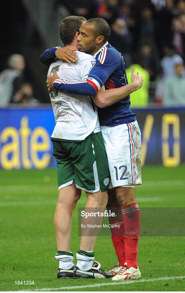 18 November 2009; Richard Dunne, Republic of Ireland, with theirry Henry, France, after the game. FIFA 2010 World Cup Qualifying Play-off 2nd Leg, Republic of Ireland v France, Stade de France, Saint-Denis, Paris, France. Picture credit: Stephen McCarthy / SPORTSFILE